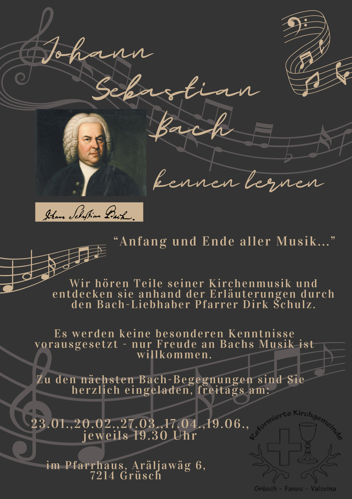 Bach-Verein Chur, Ich steh mit einem Fuss im Grabe – Kantaten von J.S Bach. 21.03.2026 in der ref. Kirche Grüsch um 19.00 Uhr im Pfarrhaus Grüsch